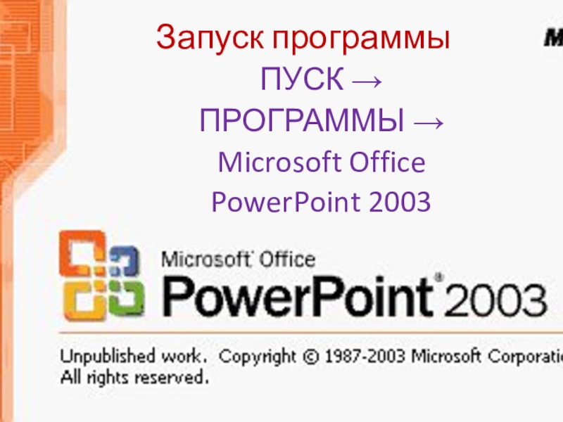 Запуск программыПУСК → ПРОГРАММЫ →Microsoft Office PowerPoint 2003