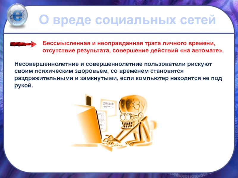 Несовершеннолетние и совершеннолетние пользователи рискуют своим психическим здоровьем, со временем становятся раздражительными и замкнутыми, если компьютер находится не под рукой.
