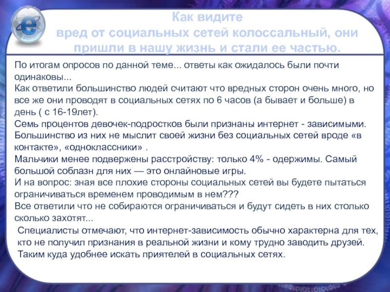 вред от социальных сетей колоссальный, они пришли в нашу жизнь и стали ее частью.