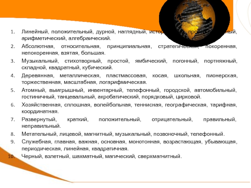 Атомный, выигрышный, инвентарный, телефонный, городской, автомобильный, гостиничный, танцевальный, акробатический, порядковый, цирковой.