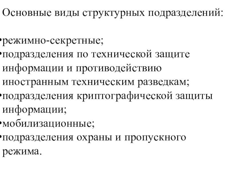 Основные виды структурных подразделений:режимно-секретные;подразделения по технической защите информации и противодействию иностранным техническим разведкам;подразделения криптографической защиты информации; мобилизационные;подразделения