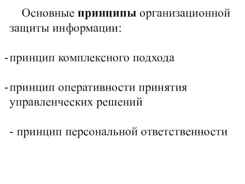 Основные принципы организационной защиты информации:принцип комплексного подходапринцип оперативности принятия управленческих решений- принцип персональной ответственности
