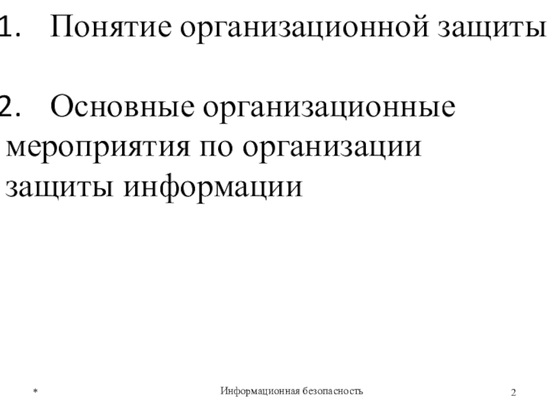 *Информационная безопасностьПонятие организационной защитыОсновные организационные мероприятия по организации защиты информации
