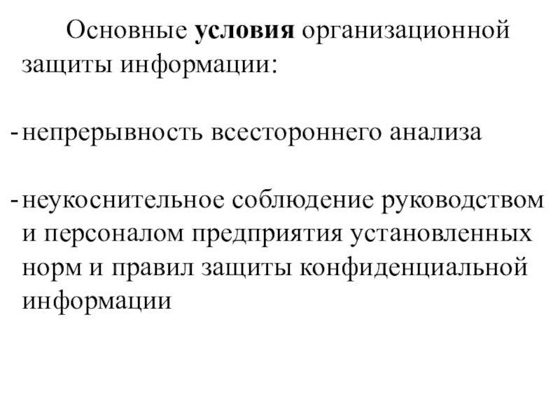 Основные условия организационной защиты информации:непрерывность всестороннего анализанеукоснительное соблюдение руководством и персоналом предприятия установленных норм и правил защиты