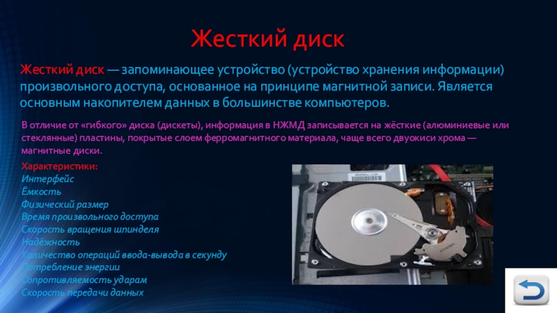 В отличие от «гибкого» диска (дискеты), информация в НЖМД записывается на жёсткие (алюминиевые или стеклянные) пластины, покрытые слоем ферромагнитного материала, чаще всего двуокиси хрома — магнитные диски.
