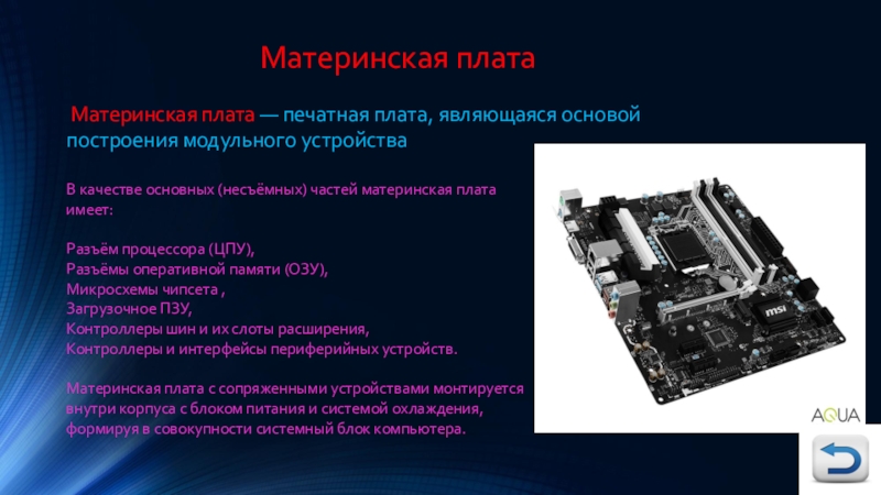 В качестве основных (несъёмных) частей материнская плата имеет: