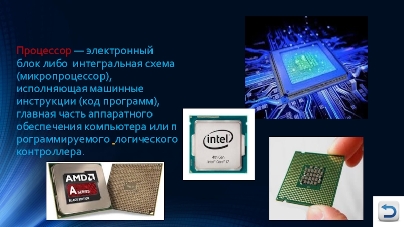 Изначально термин центральное процессорное устройство описывал специализированный класс логических машин, предназначенных для выполнения сложных компьютерных программ. Вследствие довольно точного соответствия этого назначения функциям существовавших в то время компьютерных процессоров, он естественным образом был перенесён на сами компьютеры. Начало применения термина и его аббревиатуры по отношению к компьютерным системам было положено в 1960-е годы. Устройство, архитектура и реализация процессоров с тех пор неоднократно менялись, однако их основные исполняемые функции остались теми же, что и прежде.