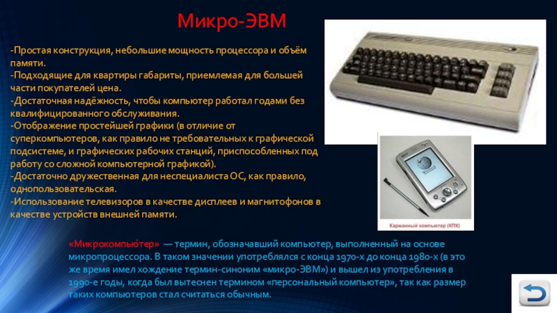 -Простая конструкция, небольшие мощность процессора и объём памяти.