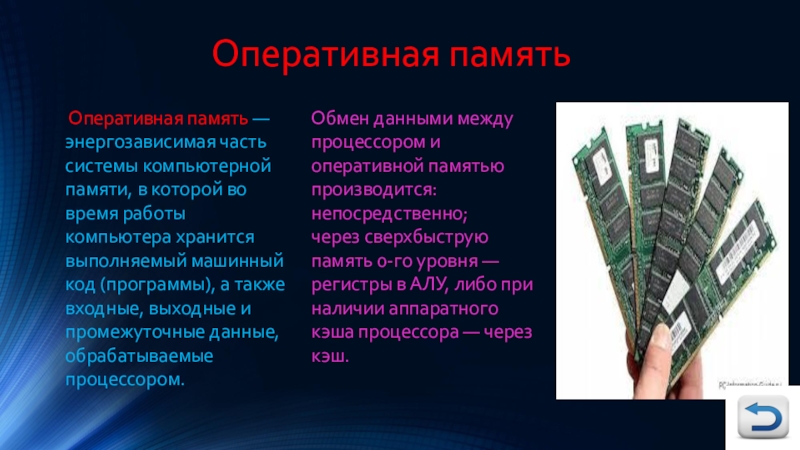 через сверхбыструю память 0-го уровня — регистры в АЛУ, либо при наличии аппаратного кэша процессора — через кэш.