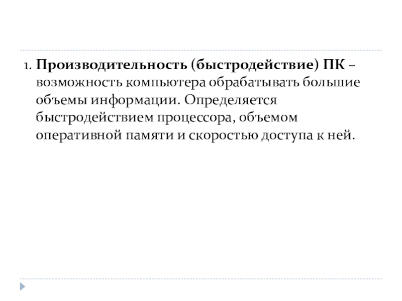 1. Производительность (быстродействие) ПК – возможность компьютера обрабатывать большие объемы информации. Определяется быстродействием процессора, объемом оперативной памяти