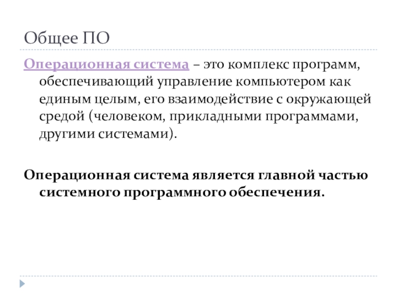 Общее ПООперационная система – это комплекс программ, обеспечивающий управление компьютером как единым целым, его взаимодействие с окружающей