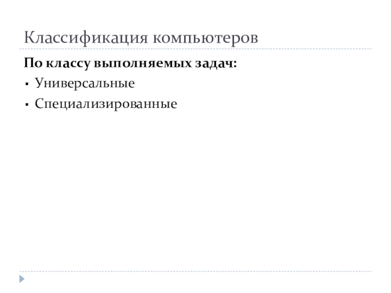 Классификация компьютеровПо классу выполняемых задач:УниверсальныеСпециализированные
