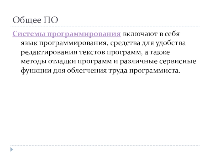 Общее ПОСистемы программирования включают в себя язык программирования, средства для удобства редактирования текстов программ, а также методы