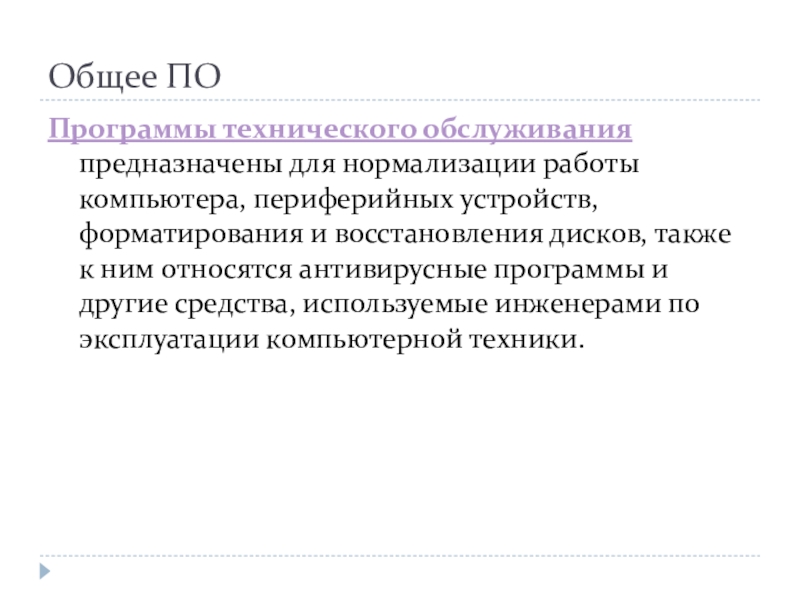 Общее ПОПрограммы технического обслуживания предназначены для нормализации работы компьютера, периферийных устройств, форматирования и восстановления дисков, также к