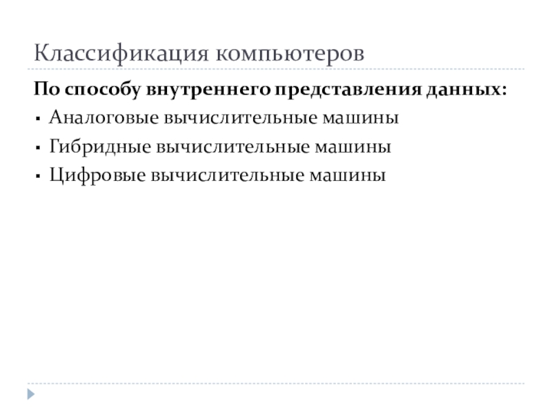Классификация компьютеровПо способу внутреннего представления данных:Аналоговые вычислительные машиныГибридные вычислительные машиныЦифровые вычислительные машины