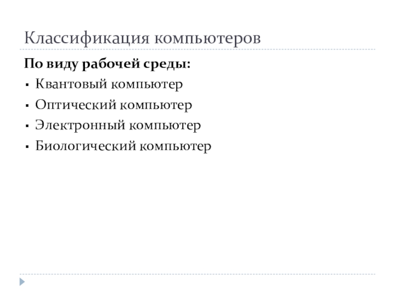 Классификация компьютеровПо виду рабочей среды:Квантовый компьютерОптический компьютерЭлектронный компьютерБиологический компьютер