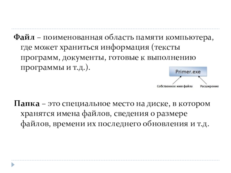 Файл – поименованная область памяти компьютера, где может храниться информация (тексты программ, документы, готовые к выполнению программы