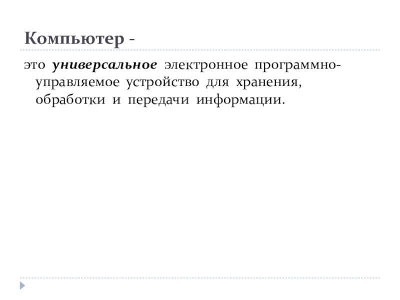 Компьютер -это универсальное электронное программно-управляемое устройство для хранения, обработки и передачи информации.