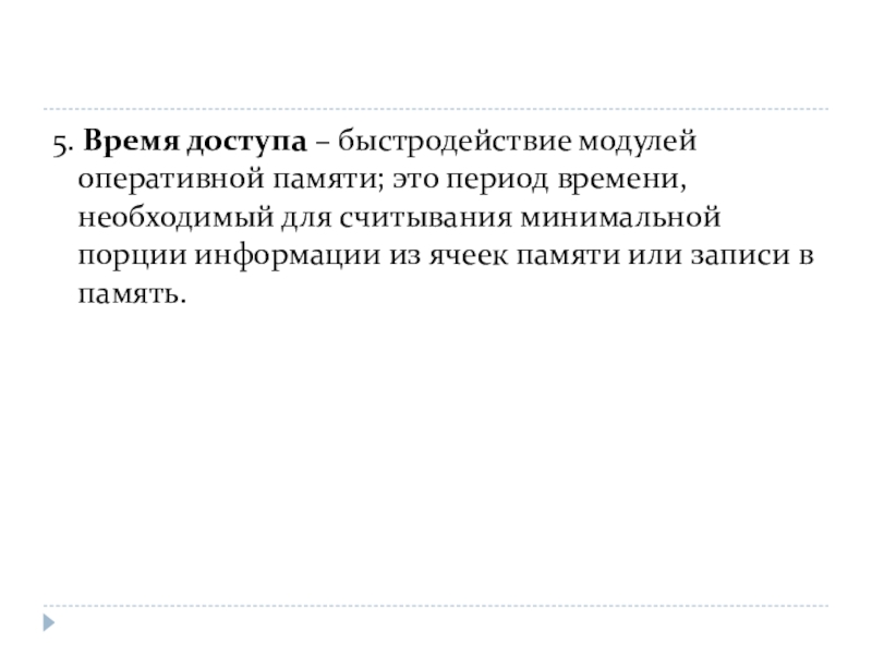 5. Время доступа – быстродействие модулей оперативной памяти; это период времени, необходимый для считывания минимальной порции информации