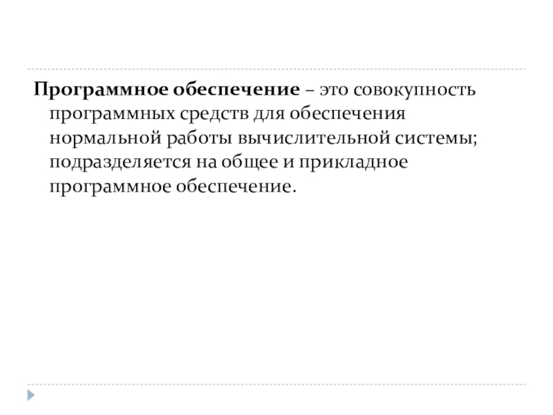 Программное обеспечение – это совокупность программных средств для обеспечения нормальной работы вычислительной системы; подразделяется на общее и
