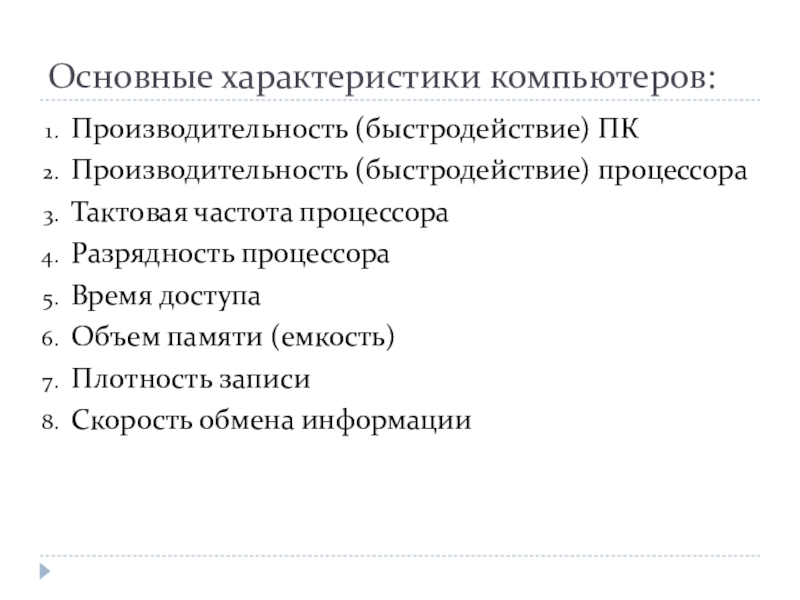 Основные характеристики компьютеров:Производительность (быстродействие) ПКПроизводительность (быстродействие) процессораТактовая частота процессораРазрядность процессораВремя доступаОбъем памяти (емкость)Плотность записиСкорость обмена информации