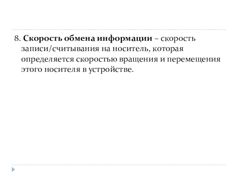 8. Скорость обмена информации – скорость записи/считывания на носитель, которая определяется скоростью вращения и перемещения этого носителя
