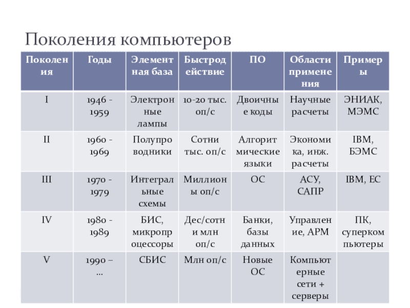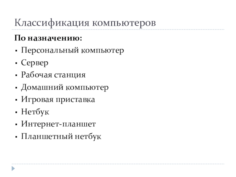 Классификация компьютеровПо назначению:Персональный компьютерСерверРабочая станцияДомашний компьютерИгровая приставкаНетбукИнтернет-планшетПланшетный нетбук