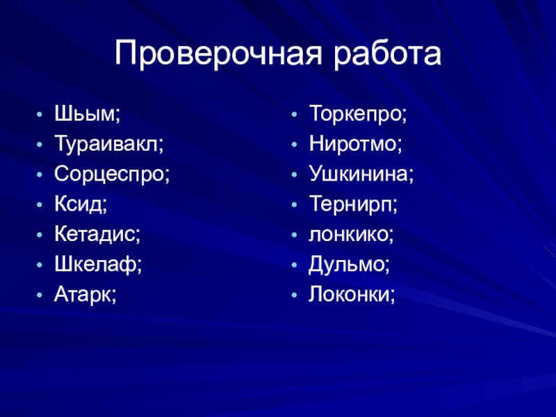 Проверочная работаШьым;Тураивакл;Сорцеспро;Ксид;Кетадис;Шкелаф;Атарк;Торкепро;Ниротмо;Ушкинина;Тернирп;лонкико;Дульмо;Локонки;