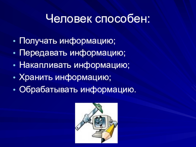 Человек способен: Получать информацию;Передавать информацию;Накапливать информацию;Хранить информацию;Обрабатывать информацию.