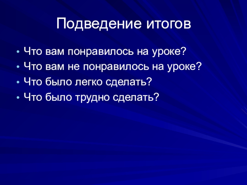 Подведение итоговЧто вам понравилось на уроке?Что вам не понравилось на уроке?Что было легко сделать?Что было трудно сделать?