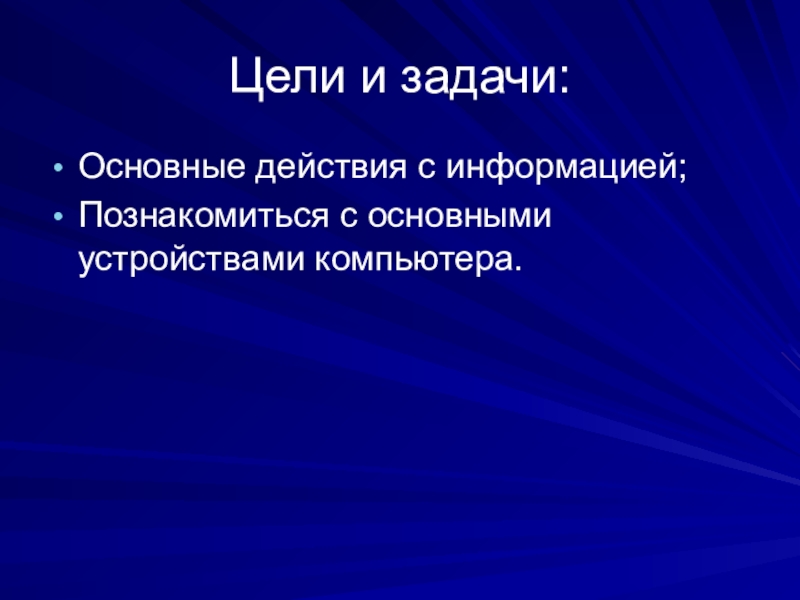 Цели и задачи: Основные действия с информацией;Познакомиться с основными устройствами компьютера.
