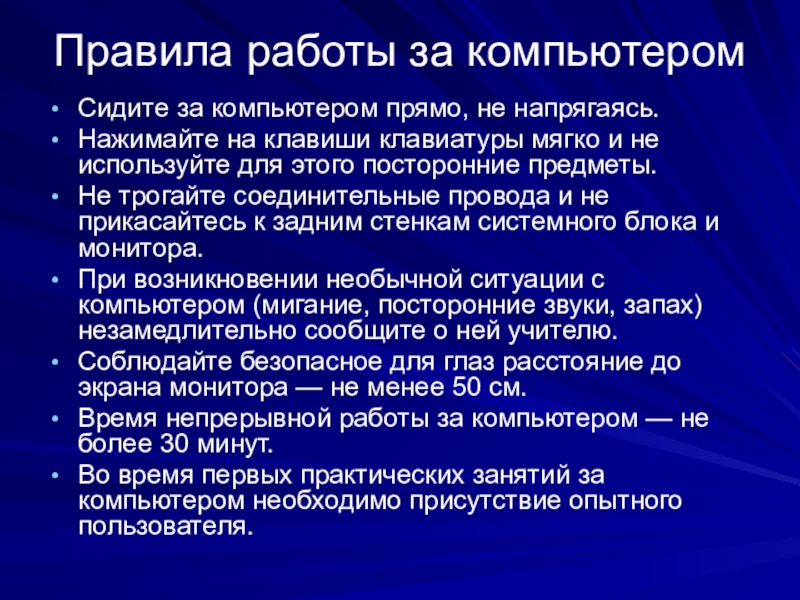 Правила работы за компьютеромСидите за компьютером прямо, не напрягаясь.Нажимайте на клавиши клавиатуры мягко и не используйте для