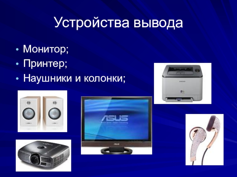 Устройства вывода Монитор;Принтер;Наушники и колонки;