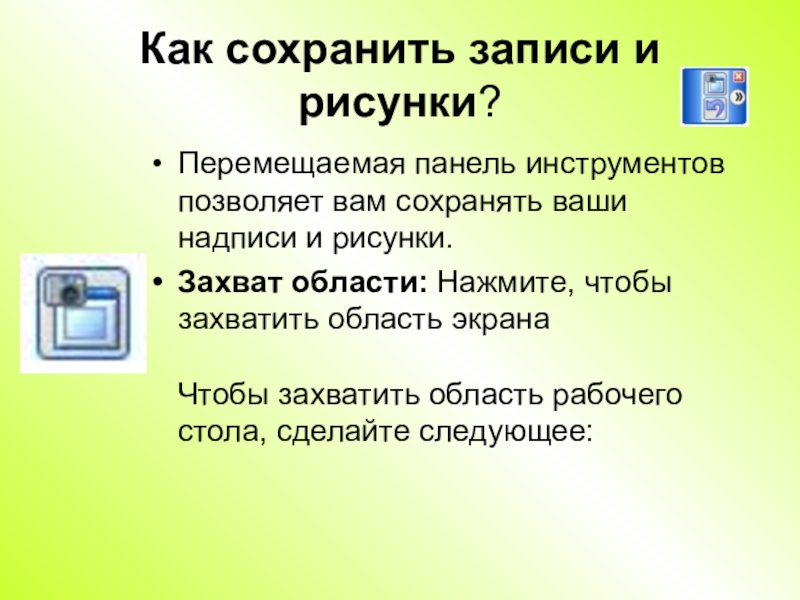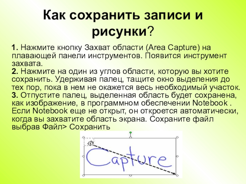 Как сохранить записи и рисунки?Перемещаемая панель инструментов позволяет вам сохранять ваши надписи и рисунки. Захват области: Нажмите,