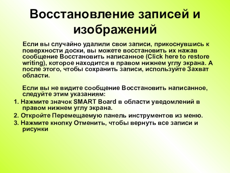 Восстановление записей и изображений   Если вы случайно удалили свои записи, прикоснувшись к поверхности доски, вы