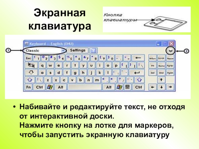Экранная  клавиатура Набивайте и редактируйте текст, не отходя от интерактивной доски. Нажмите кнопку на лотке для
