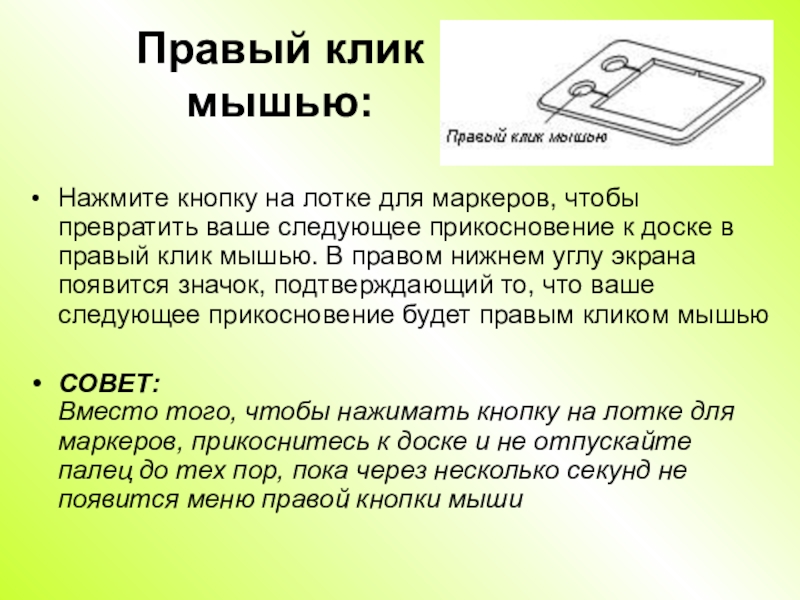 ваше следующее прикосновение к доске в правый клик мышью. В правом нижнем углу экрана появится значок, подтверждающий то, что ваше следующее прикосновение будет правым кликом мышью