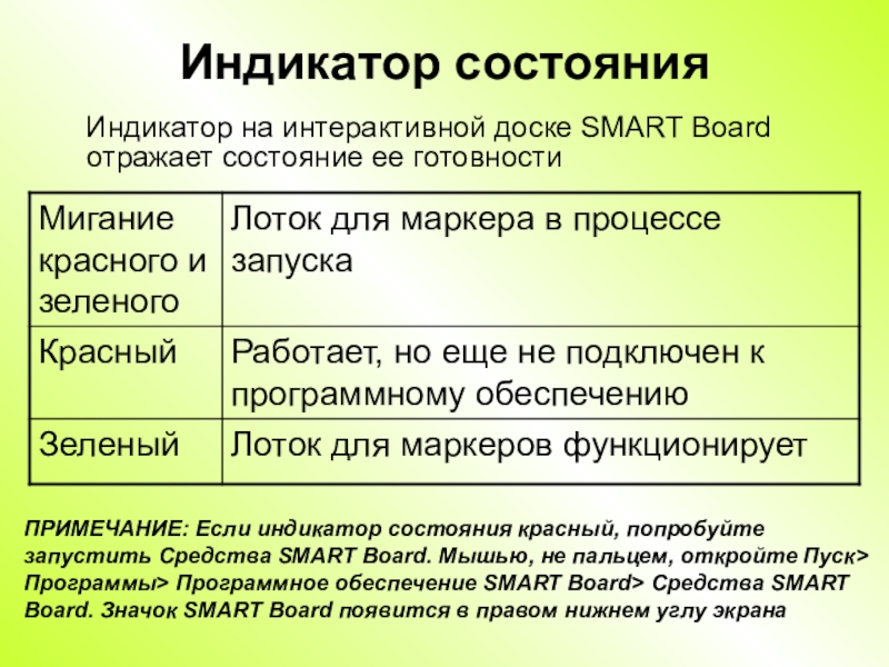 ПРИМЕЧАНИЕ: Если индикатор состояния красный, попробуйте запустить Средства SMART Board. Мышью, не пальцем, откройте Пуск> Программы> Программное обеспечение SMART Board> Средства SMART Board. Значок SMART Board появится в правом нижнем углу экрана