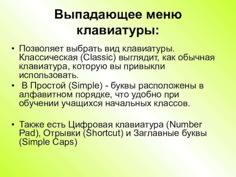 Выпадающее меню клавиатуры: Позволяет выбрать вид клавиатуры. Классическая (Classic) выглядит, как обычная клавиатура, которую вы привыкли использовать.