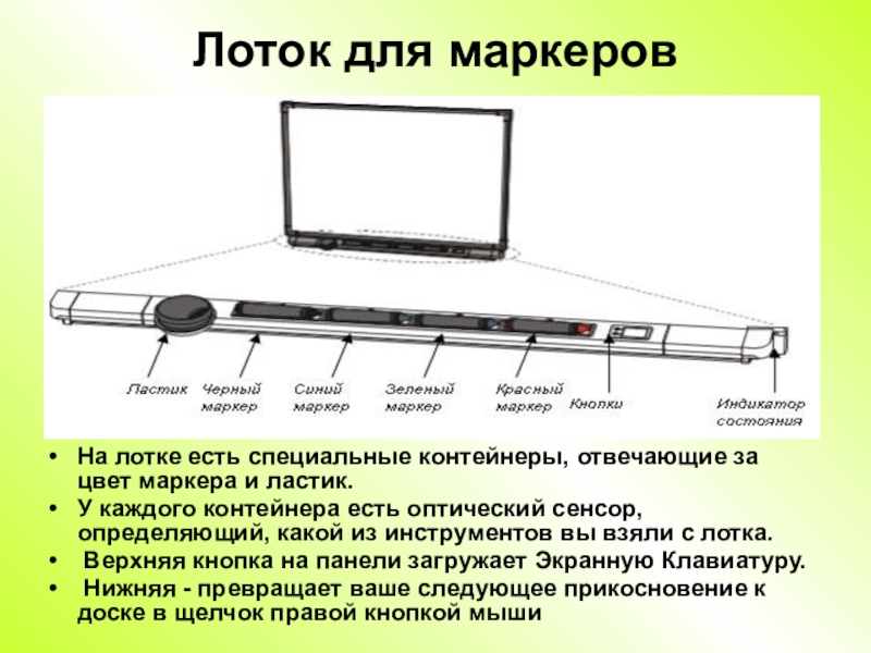 Лоток для маркеров  На лотке есть специальные контейнеры, отвечающие за цвет маркера и ластик. У каждого