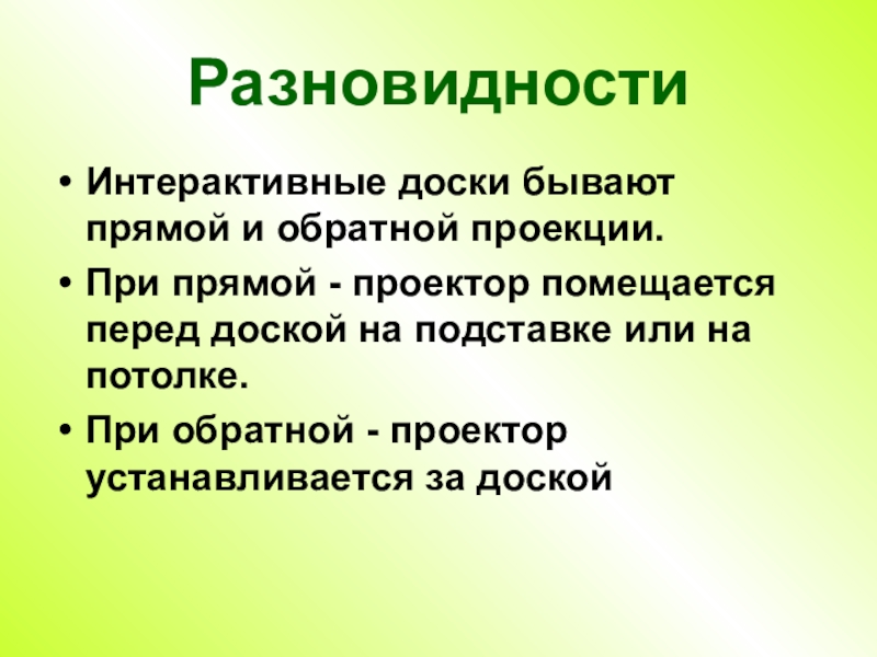 РазновидностиИнтерактивные доски бывают прямой и обратной проекции.При прямой - проектор помещается перед доской на подставке или на