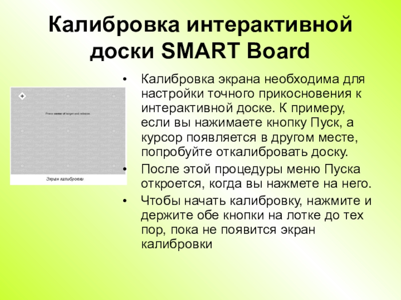 Калибровка интерактивной доски SMART Board Калибровка экрана необходима для настройки точного прикосновения к интерактивной доске. К примеру,