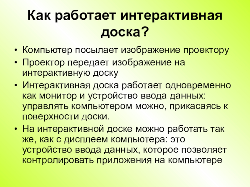 Как работает интерактивная доска?Компьютер посылает изображение проекторуПроектор передает изображение на интерактивную доскуИнтерактивная доска работает одновременно как монитор