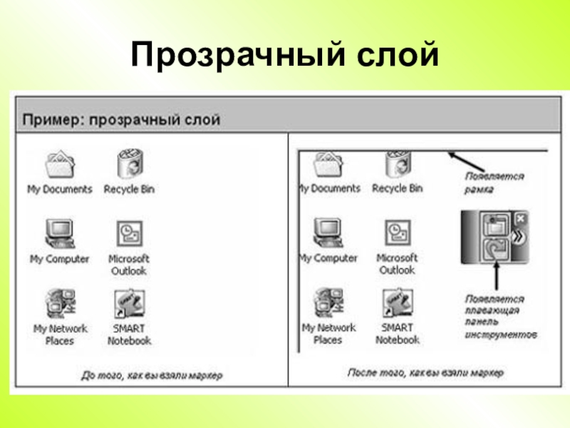 взяв маркер с лотка. Прозрачный слой Когда вы берете маркер с лотка, появляется перемещаемая панель инструментов и рамка вокруг рабочего стола. Рамка означает, что вы можете писать поверх рабочего стола, и остается до тех пор, пока вы не положите маркер или ластик обратно на лоток и не коснетесь доски. Ваше первое прикосновение к доске удалит рамку и все ваши записи