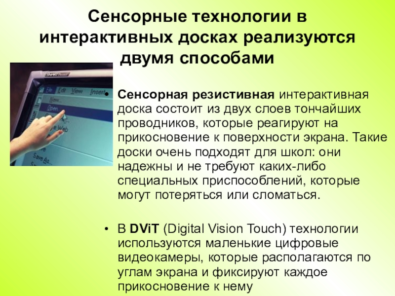 Слайд 7Сенсорные технологии в интерактивных досках реализуются двумя способами