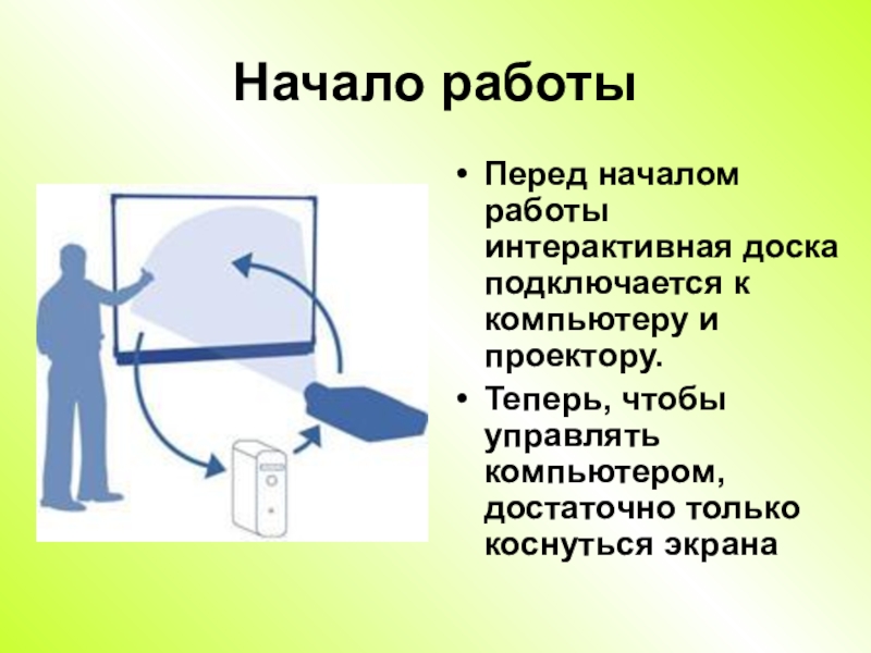 Начало работыПеред началом работы интерактивная доска подключается к компьютеру и проектору. Теперь, чтобы управлять компьютером, достаточно только