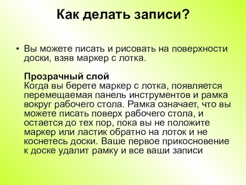 Как делать записи?  Вы можете писать и рисовать на поверхности доски, взяв маркер с лотка.