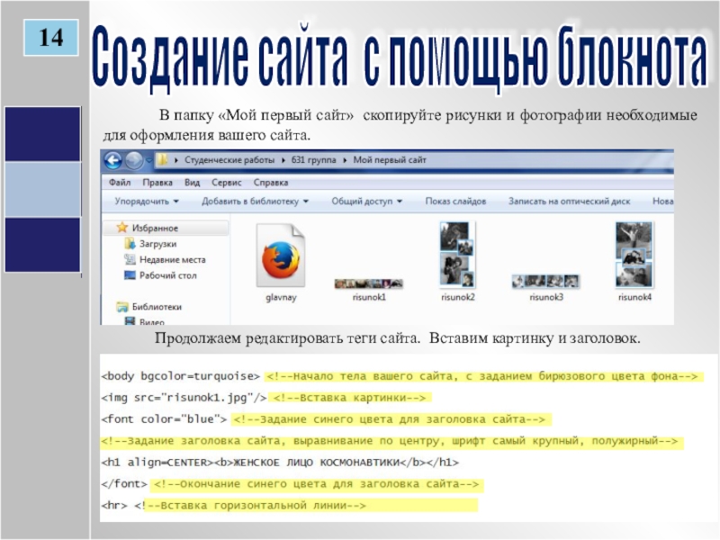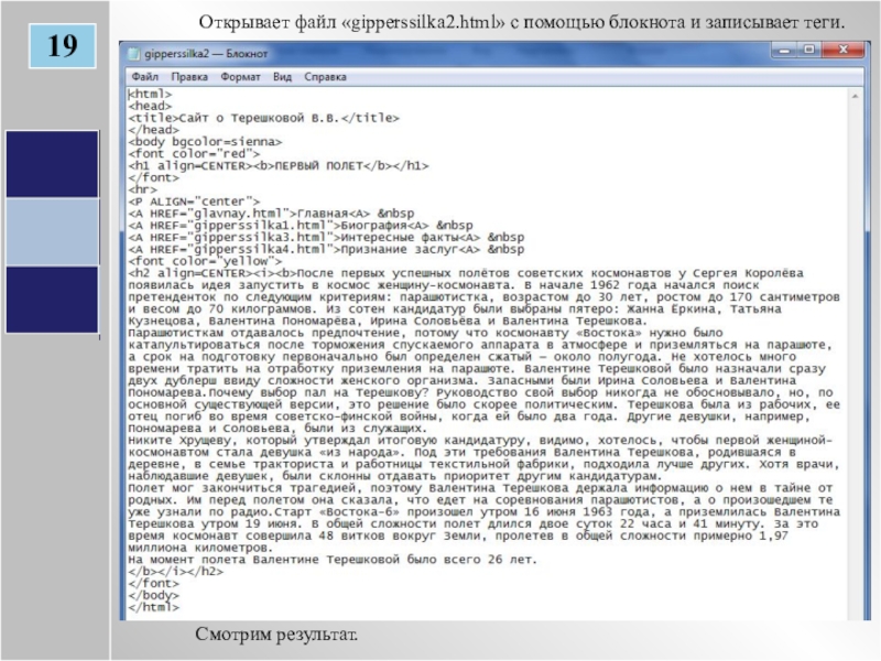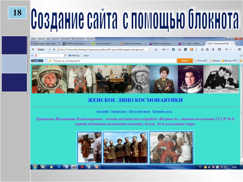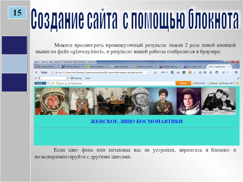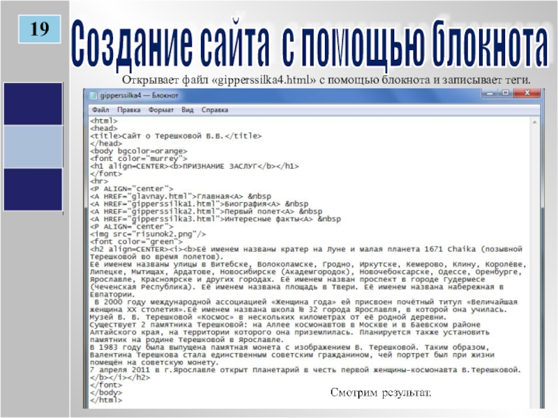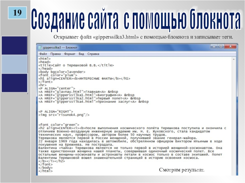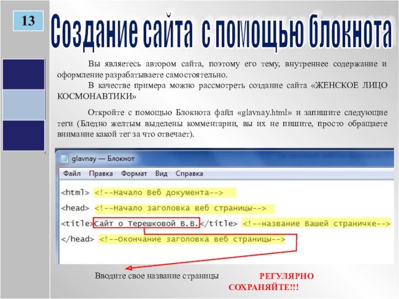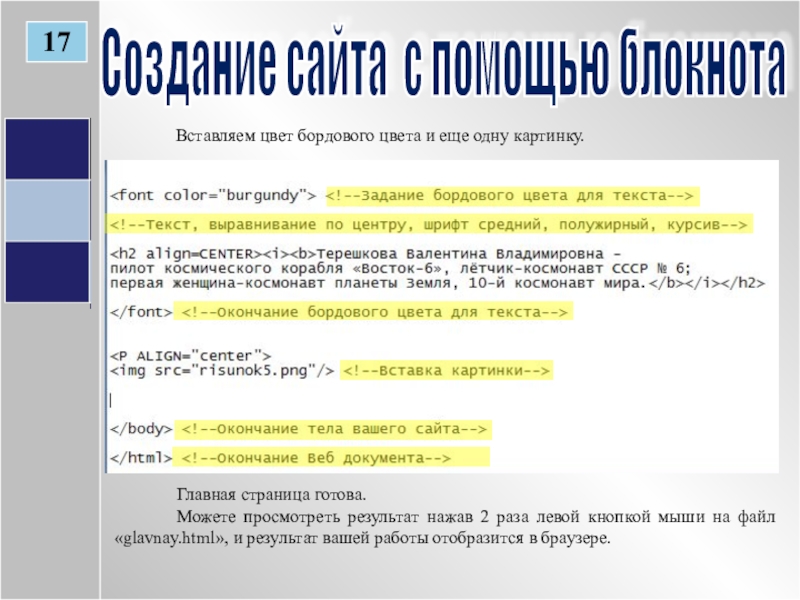 разрабатываете самостоятельно. В качестве примера можно рассмотреть создание сайта «ЖЕНСКОЕ ЛИЦО КОСМОНАВТИКИ» Откройте с помощью Блокнота файл «glavnay.html» и запишите следующие теги (Бледно желтым выделены комментарии, вы их не пишите, просто обращаете внимание какой тег за что отвечает). Создание сайта с помощью блокнота