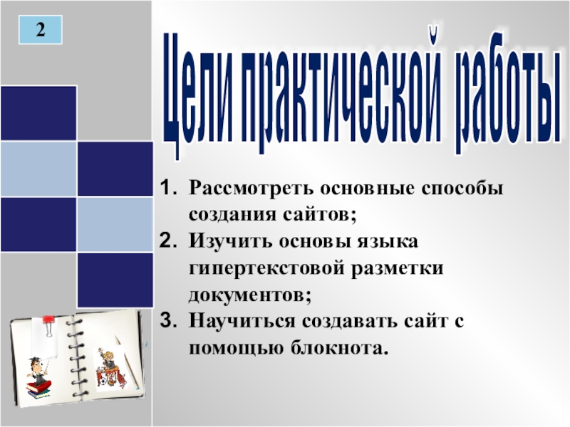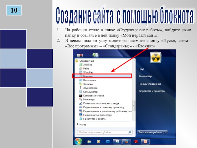 создайте в ней папку «Мой первый сайт»; В левом нижнем углу монитора нажмите кнопку «Пуск», затем - «Все программы» – «Стандартные» - «Блокнот» Создание сайта с помощью блокнота