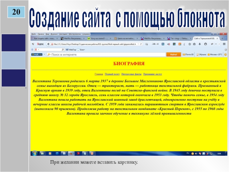 Создание сайта с помощью блокнота 20 При желании можете вставить картинку.